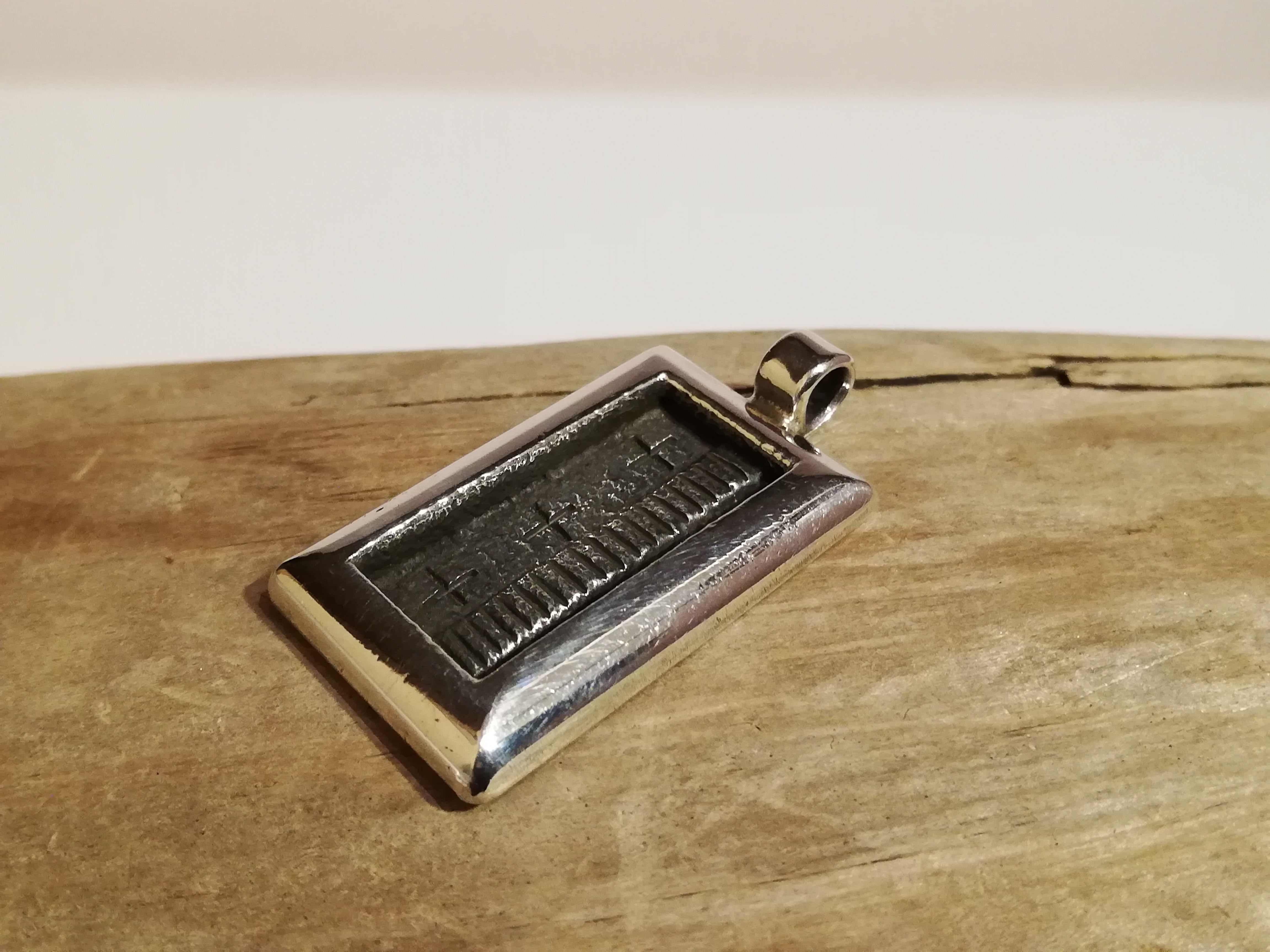 トゥファストーンという石を彫刻し、溶かした銀を流し込む技法、トゥファキャストで作られています。端がだいぶ厚みのあり立体的なシャドウボックスの形になっています。
